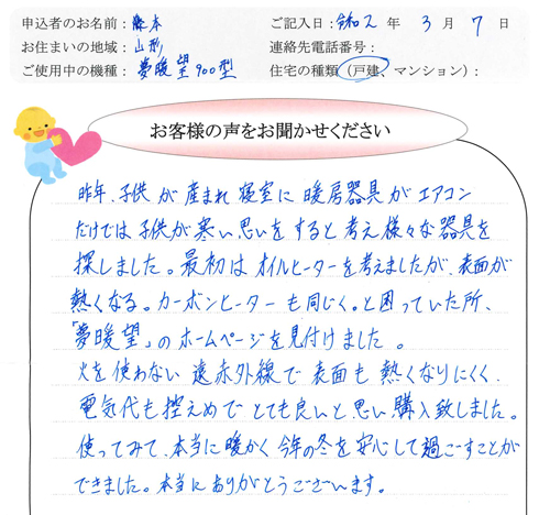 以前から遠赤外線のヒーターの購入を検討しており、インターネット検索で夢暖望のホームページを見つけました。我が家は子供3人、大人2人で1番下の子はこの2月に生まれたばかりです。上2人の子に風邪をひかれてしまうと困るので、空気を汚さず、乾燥させない夢暖望はとても重宝しています。