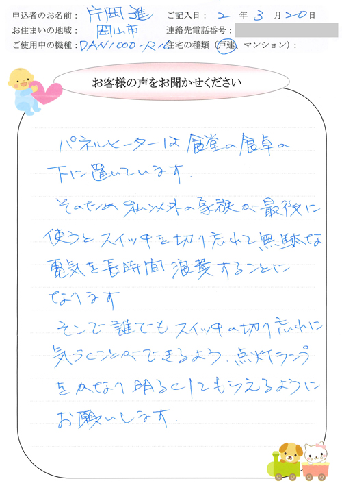 ご購入された暖話室は食堂の食卓の下に置いてご使用されているようですね。片岡さま以外のご家族が使われる時に、スイッチをうっかり切り忘れて点けっぱなしになってしまい、電気の無駄遣いをしてしまうのですね。電源ランプについてのご意見、ご要望ありがとうございます。食卓の下で使用される場合はどうしても電源ランプに目が行きにくいですね。今後の製品の改善改良の参考とさせていただきます。