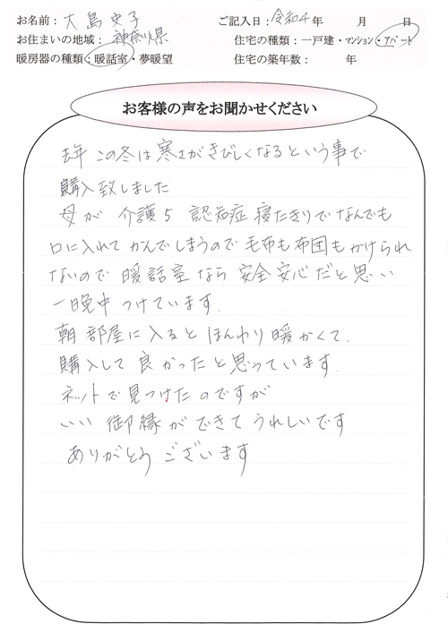 暖話室1000型2台・夢暖望660型を1台ご購入くださりありがとうございます。お母様が石油ファンヒーターの火事を気にされている事と、室温のコントロールが難しい様子だったのでそれに代わる暖房器を探している時に弊社の暖房器と出合ったのですね。