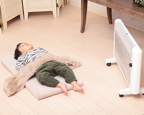 ──「夢暖望や暖話室」からでる遠赤外線は空気を温めず人体や壁や床を直接温めてくれるので空気を乾燥させずにすむんです。